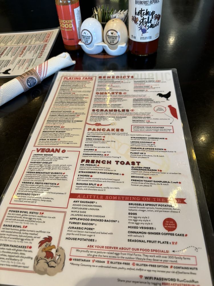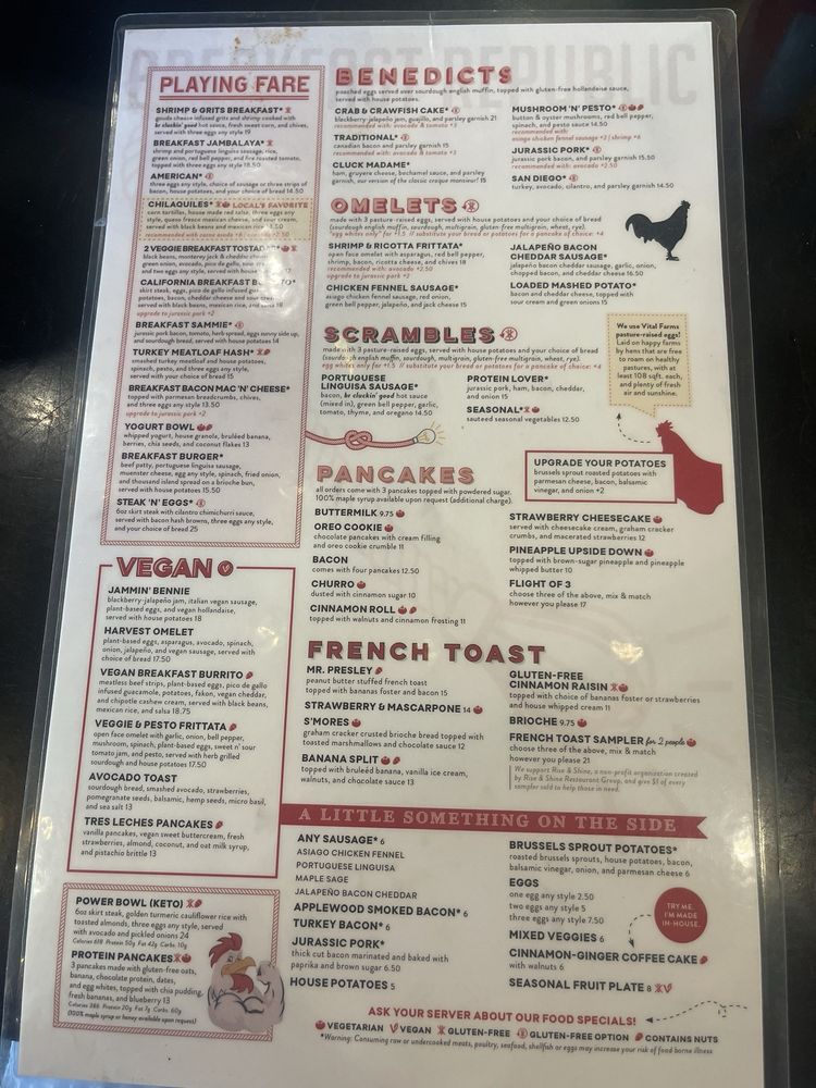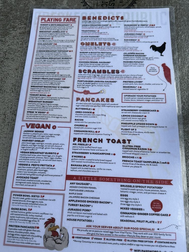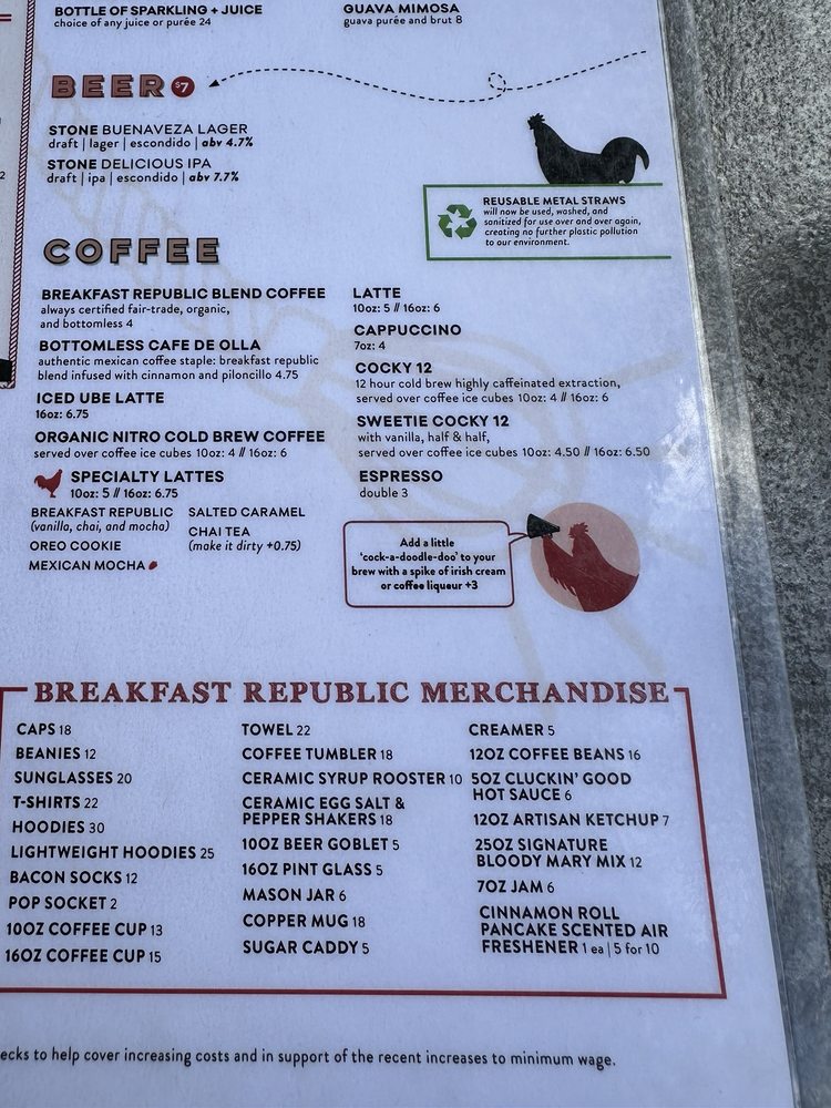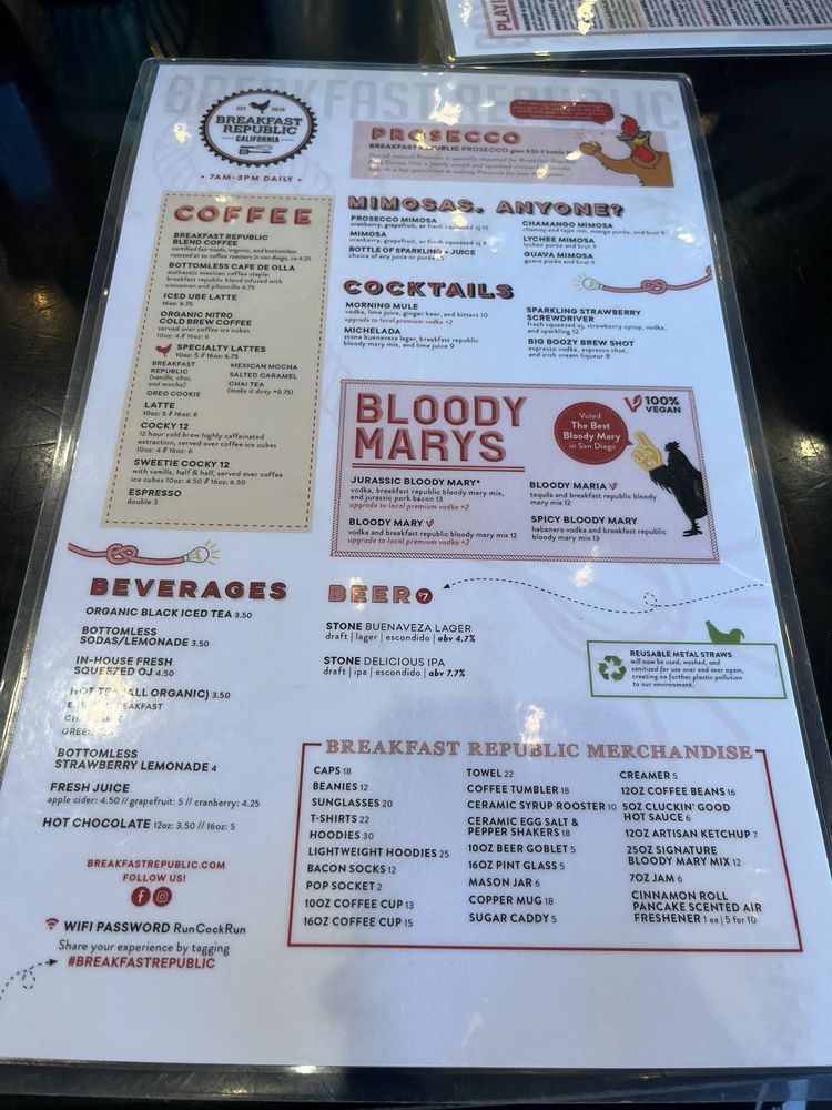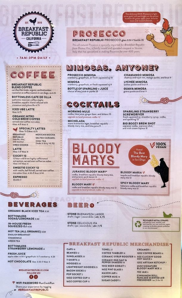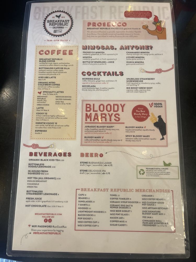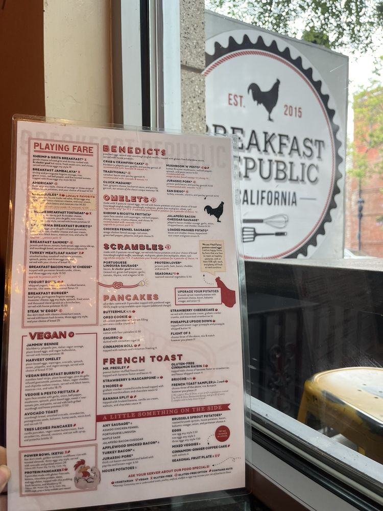 Introducing Breakfast Republic, a trendy and hipster spot in San Diego offering a unique New American breakfast and brunch menu. Highlights include vegan and vegetarian options, wheelchair accessibility, and a full bar. This inclusive eatery also caters to various dietary needs with compostable containers and plastic-free packaging. The vibrant atmosphere is perfect for groups, kids, and even dogs, with gender-neutral restrooms and free Wi-Fi available. From street parking to wait service, Breakfast Republic provides a seamless dining experience. Whether you're looking for a leisurely brunch or a delicious lunch, this spot has you covered. Don't miss out on their happy hour specials and outdoor seating for a relaxing meal in the heart of San Diego. Perfect for foodies seeking a unique and sustainable dining experience.